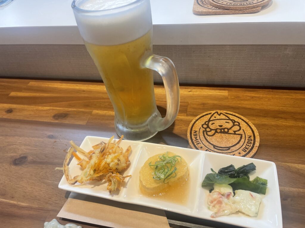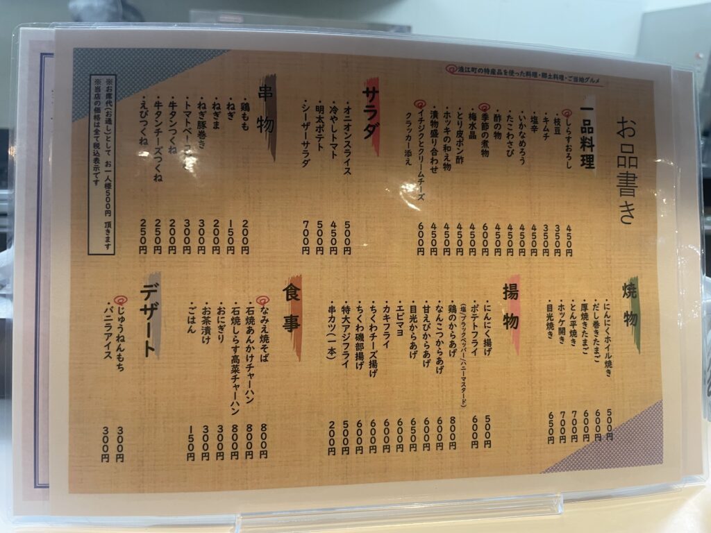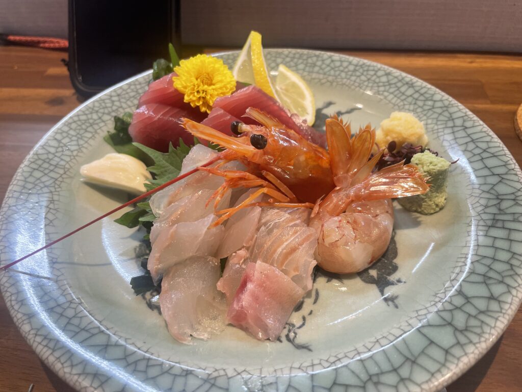 お通しからオシャレで美味しかったので、オススメ看板にあった刺盛りとポテサラと串物を少し注文してみました。