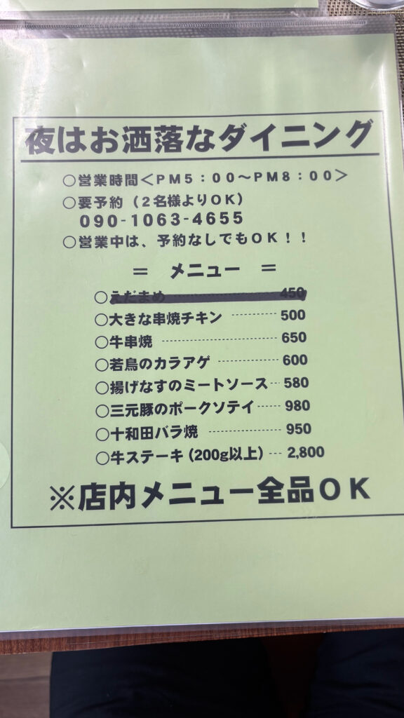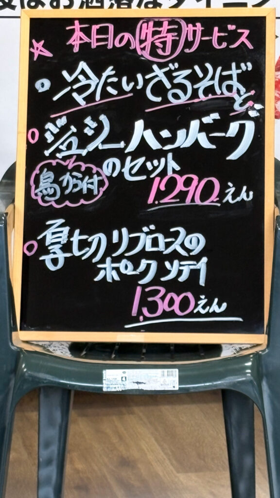 すると、夜の限定メニューやら壁にしか無いメニューがあり、ちゃんと見ないと見落としそうな感じでした。特別メニューでリブロースやハンバーグとかもあるみたいです(笑)